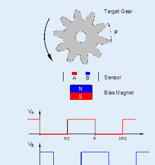 传感器由两个霍尔效应元件组成,这些元件由磁铁偏置,以检测由铁质目标齿轮旋转引起的磁场强度变化。当目标档位经过传感器元件 A 时,输出在目标档位的一半螺距 (P/2) 处从逻辑 0 切换到逻辑 1。随着目标档位的继续,输出在档位 (P) 处从逻辑 1 切换到逻辑 0。传感器元件 B 与元件 A 相距目标齿轮节距的四分之一 (P/4)。元件 B 的输出与元件 A 的输出相移四分之一 (P/4)。在电气术语中,这会产生 90° 的相位差。当齿轮逆时针转动时,输出 A 相位领先于输出 B。当齿轮顺时针转动时,输出 A 滞后于输出 B。